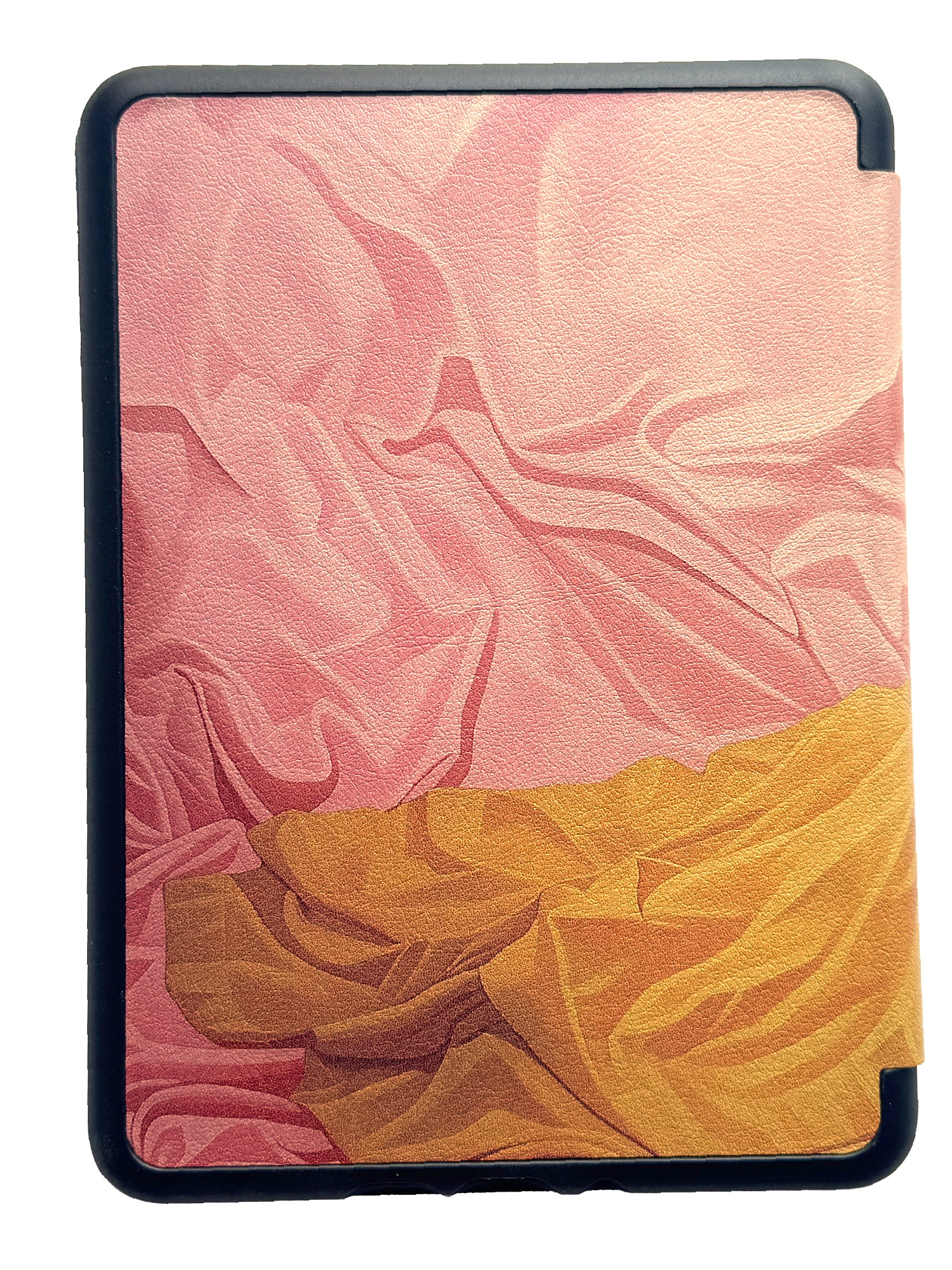 Design is printed on a vegan leather e-reader case. Wearing on the edges with use is normal, we picked the leather finish on purpose to give it that worn-in vintage feel.
