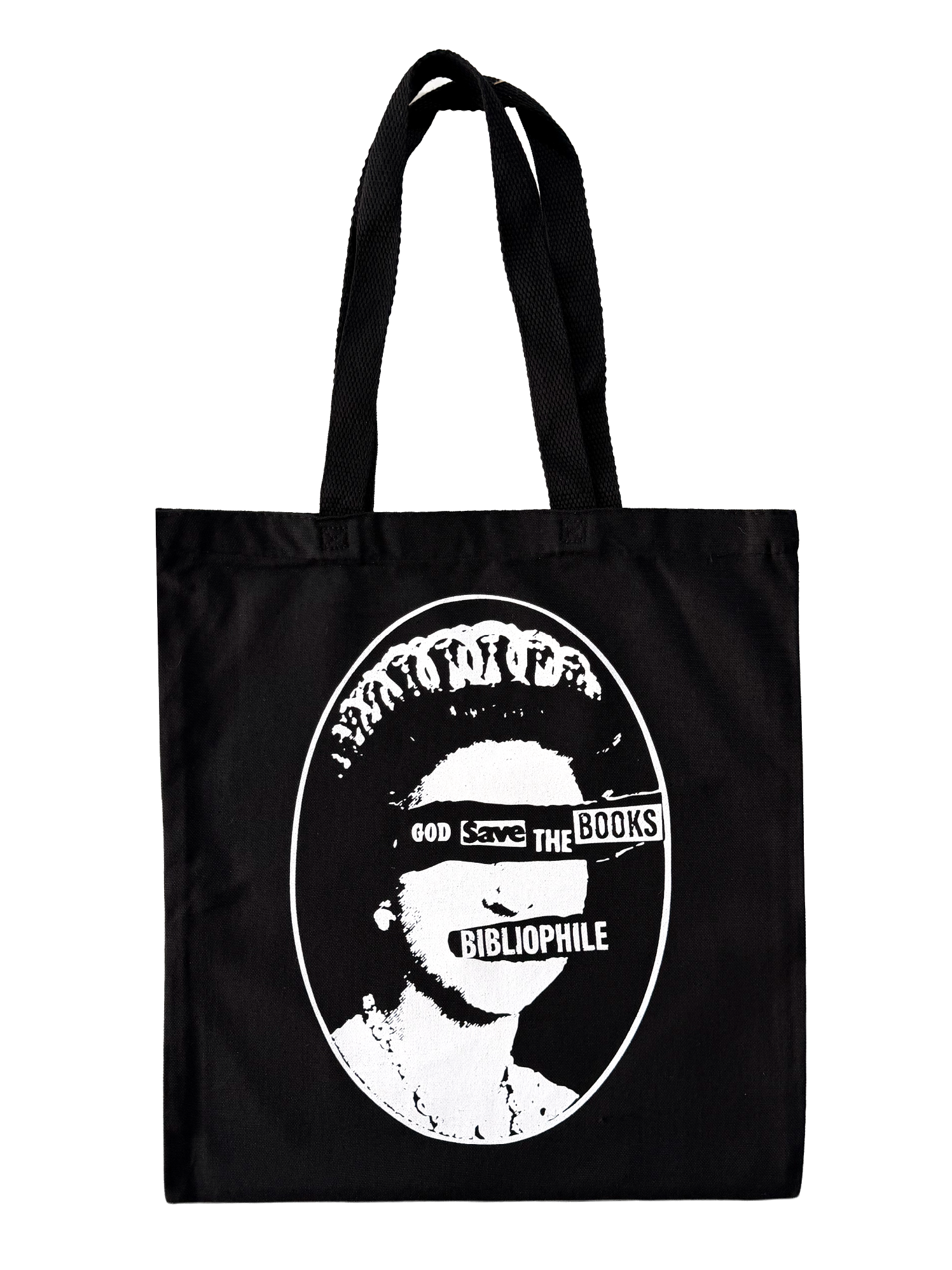 "God save the books" and "Bibliophile" screenprinted in white on black canvas tote.